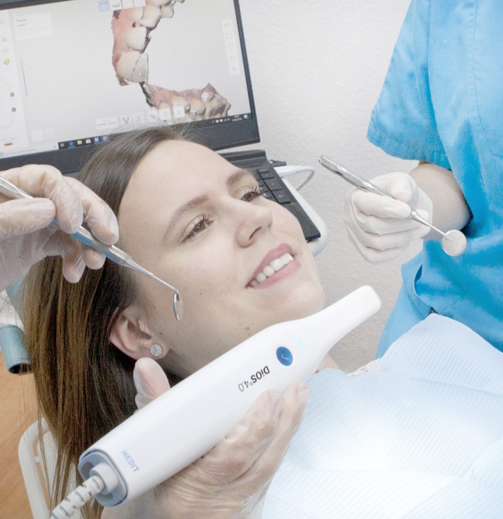 Pracujemy w oparciu o skaner Medit DiOS® 4.0, obecnie jedno z najlepszych i najnowocześniejzych urządzeń tego typu. Medit DiOS® 4.0 skanuje w kolorze, nie wymaga użycia pudru i jest bardzo szybki.